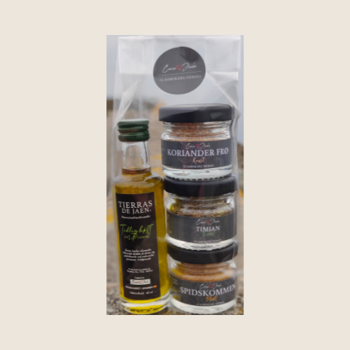 Krydderi tilbud - Ekstra Jomfru olivenolie, korianderfrø, timian og spidskommen
